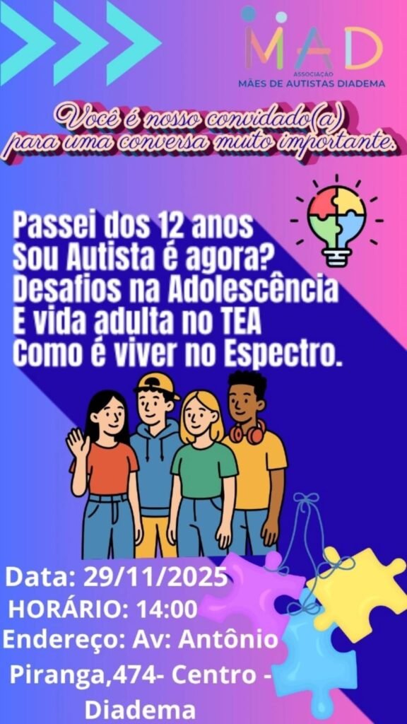 Associação Mães de Autistas de Diadema promove encontro no próximo sábado 29/11 Posted on novembro 26, 2025novembro 26, 2025 by Camargo Filho Por Camargo Filho